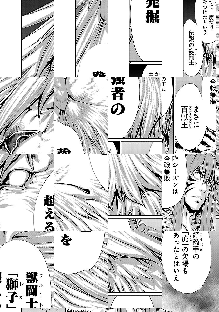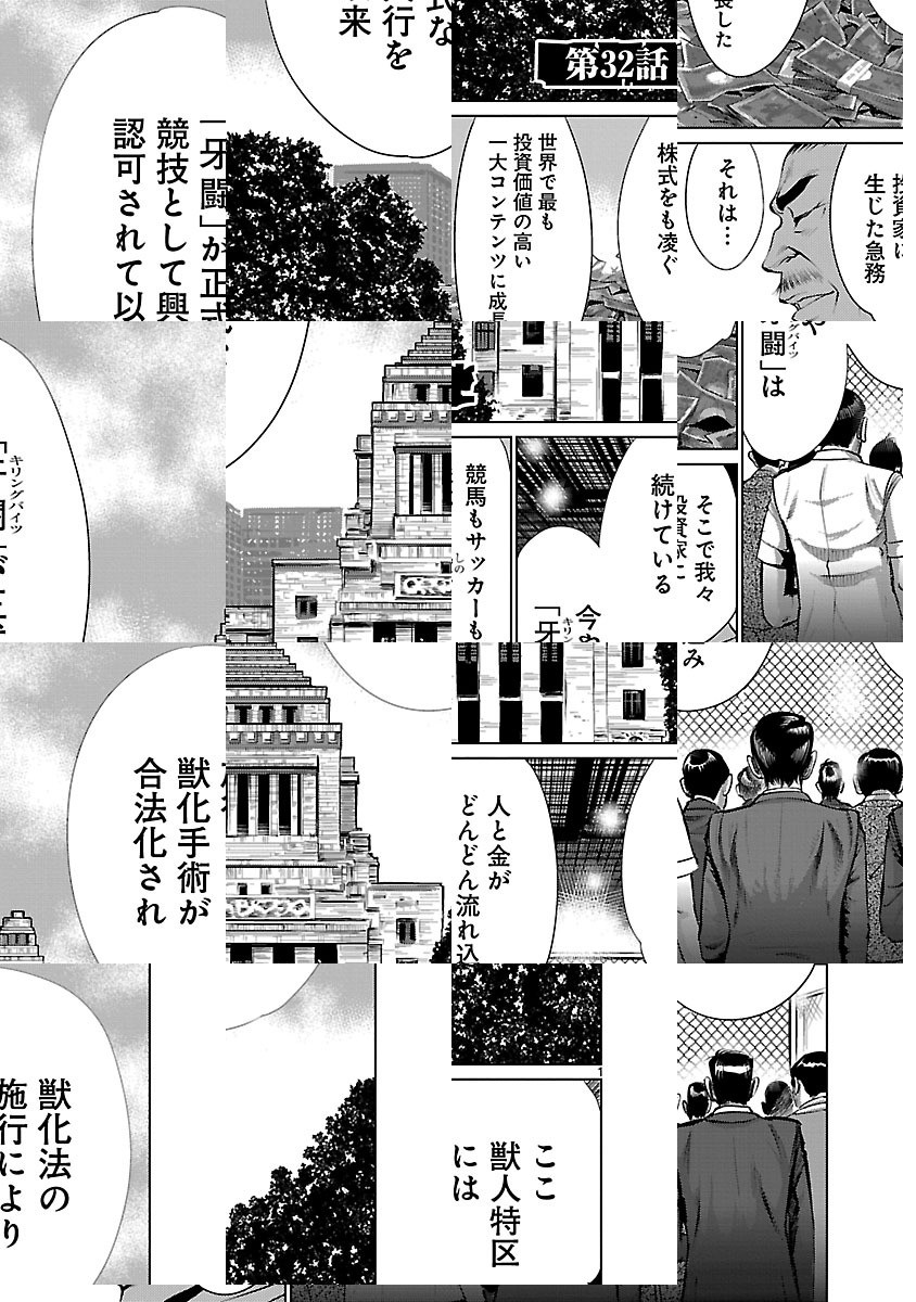 冴えない青年・野本は謎の少女・ヒトミと出会い、とある廃棄場へと連れてこられる。行き場のないモノが集められたそこでは、人の頭脳と獣の牙を併せ持つ「獣人」達による凄惨な賭け試合が行われていた——。その戦いの名は「牙闘(キリングバイツ)」——!