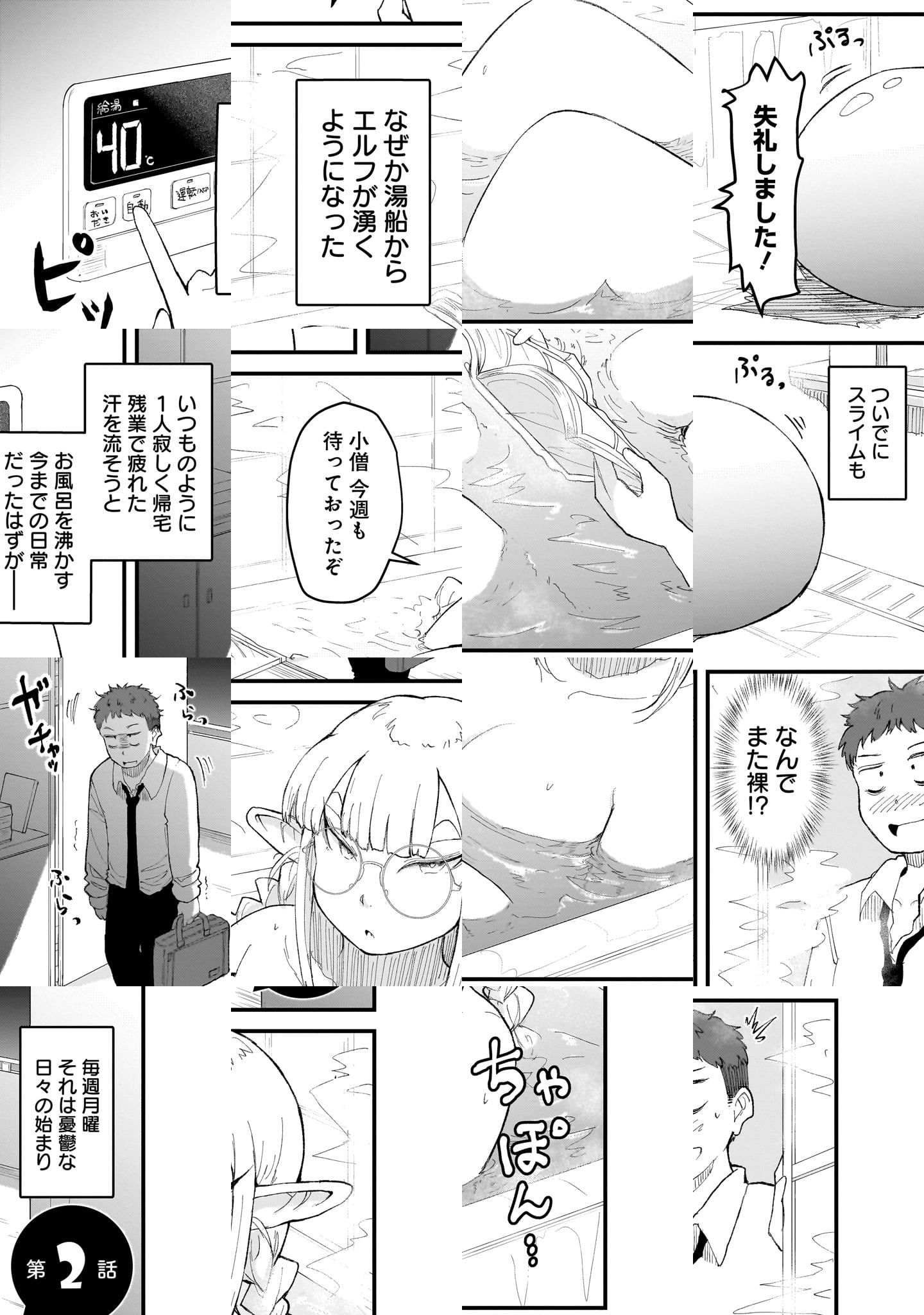 疲れ果てたサラリーマン・天野の部屋のお風呂場に、ある日突然、エルフさんが現れた!? ポンコツだけど、なんかすごい(本人談)エルフさんが人間界で漫画を読みながら、ほのぼのダラダラする異世界日常漫画。
