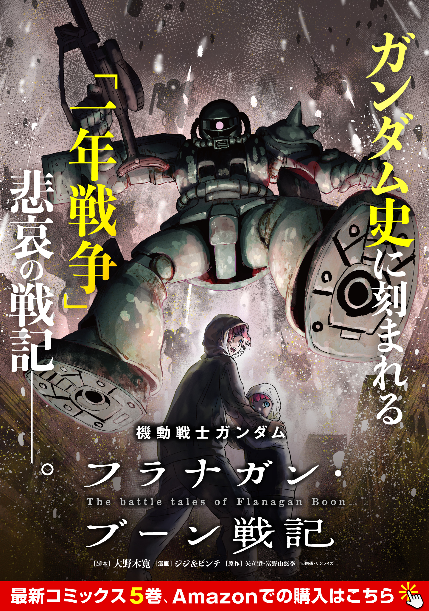新たに紡がれる「一年戦争」悲哀の戦記──。ジオン兵“フラナガン・ブーン”は敬愛するガルマ・ザビ大佐のもとで訓練に励むも、そんな矢先に“連邦の白い悪魔”ことガンダムが現れ……。アニメ『機動戦士ガンダム』の名エピソード「大西洋、血に染めて」(第28話)に登場したフラナガン・ブーンの目線で描く新たな一年戦争、開幕!