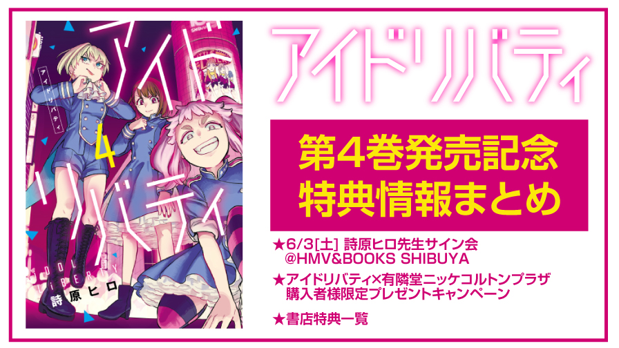 「ふらっとヒーローズ」にて連載中の『アイドリバティ』4巻が、5月15日(月)に発売されます!発売を記念して、イベント、キャンペーンの実施を予定しております。また、一部書店様にて購入特典も配布いたします。詳細につきましては、下記をご参照ください。