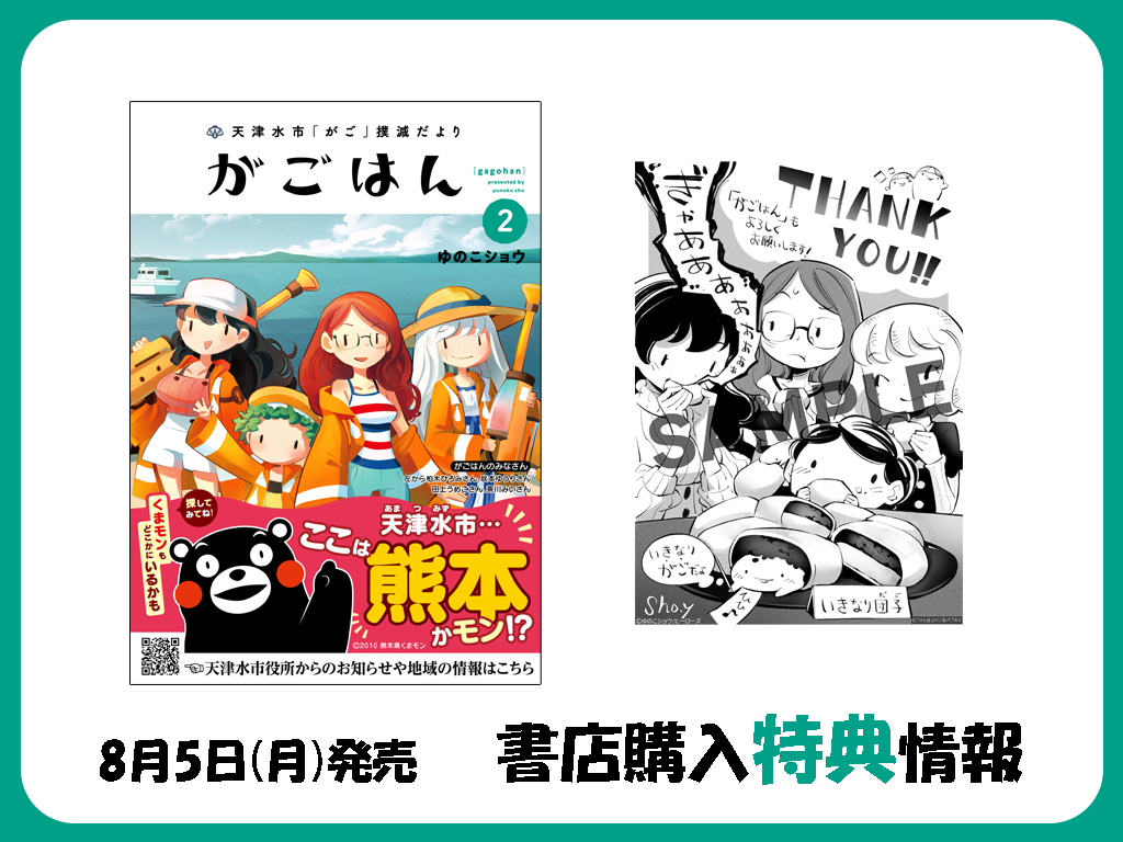 ヒーローズレーベルにて好評連載中の『天津水市「がご」撲滅だより がごはん』の第2巻が、8月5日(月)に刊行されます。これを記念し、一部の応援書店でゆのこショウ先生描きおろしイラストを使用した特典の配布が決定いたしました。